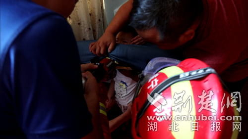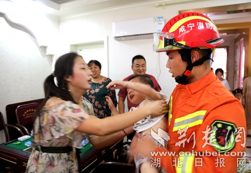 图为消防员救出小孩现场。 朱涛摄