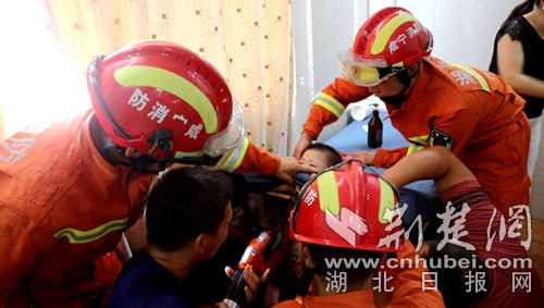 荆楚网消息(通讯员 刘丽娜 朱涛)7月10日15时09分,湖北省咸宁市消防救援支队指挥中心接到报警称:通山县龙鼎丽都美容院2楼小孩头被卡住,急需救援。接到报警后,通山县消防救援中队出动1辆消防车、6名消防指战员紧急赶赴现场进行处置。
