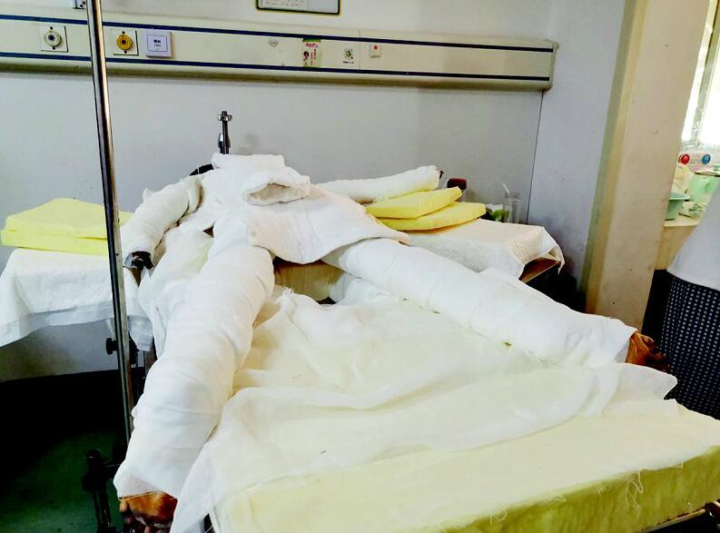 图为病床上裹满纱布的婷婷