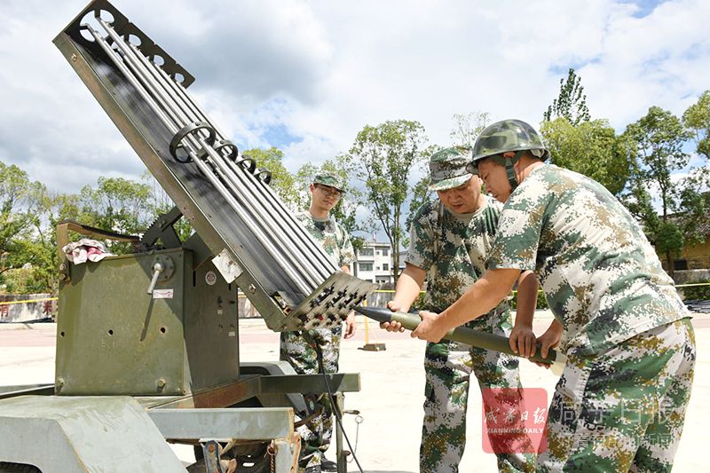 26日,在崇阳县港口乡中学,该县气象局工作人员正在此架设火箭炮,守候对流云层,抓住有利时机实施人工增雨抗旱作业。