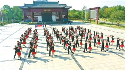 9月8日,在嘉鱼二乔公园,嘉鱼交谊舞团队100多名舞者,正在录制嘉鱼交谊舞团队与军运会同行《兵兵三步踩》,该视频将在武汉军运会期间播放。