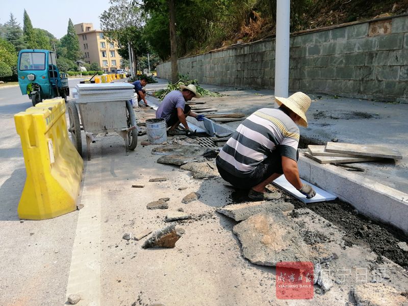 咸宁网讯(香城都市报记者周阳 通讯员许胜利 李沁)市区麦笠山路地处温泉旅游核心区,毗邻潜山国家森林公园,是重要的城市景观道路。9月12日上午,记者看到,该道路潜山广场至袁家湾路口路段700多米人行道正在进行升级改造,施工现场一片繁忙,工程车辆铺装混凝土、工人们开挖人字沟、铺设流水板……