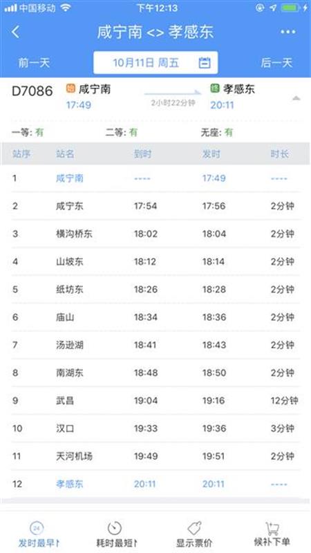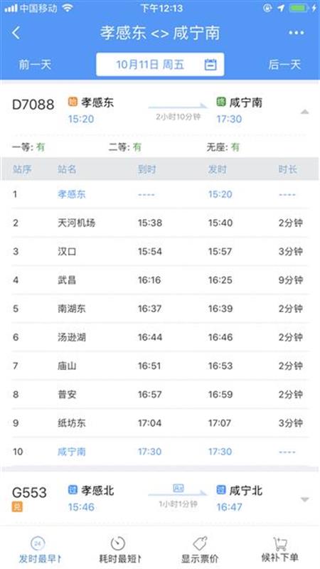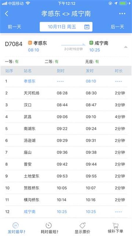 10时40分从咸宁南始发,沿途停靠咸宁东、横沟桥东、贺胜桥东、土地堂东、纸坊东、普安、庙山、汤逊湖、南湖东、武昌、汉口、天河机场等站,13时04分终到孝感东站;