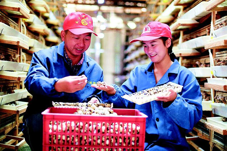 10月29日,在通城县沙堆镇石冲村,贫困户游明夫妻在捡鹌鹑蛋。在镇村干部的帮扶下,游明自学养殖鹌鹑技术,利用空闲厂房办起了养殖场,并提供鹌鹑种苗,传授养殖技术,带动周边村6户贫困户一起脱贫致富,助力乡村振兴。(视界网 刘建平 摄)