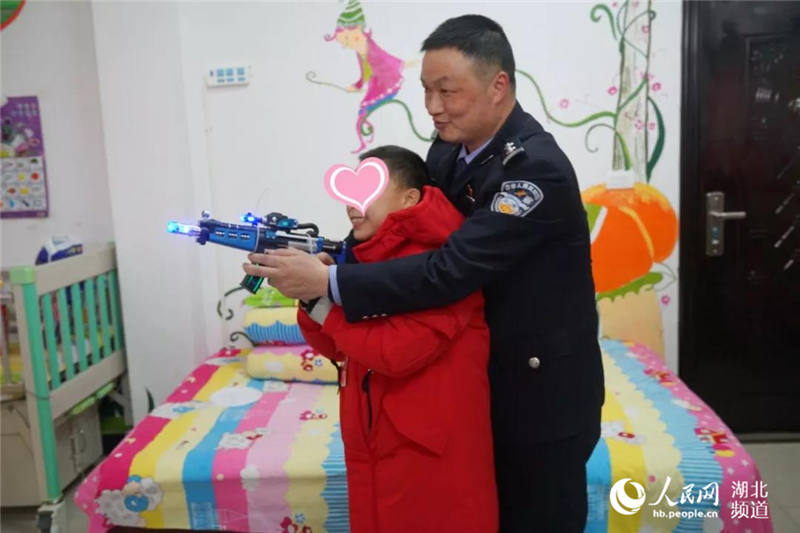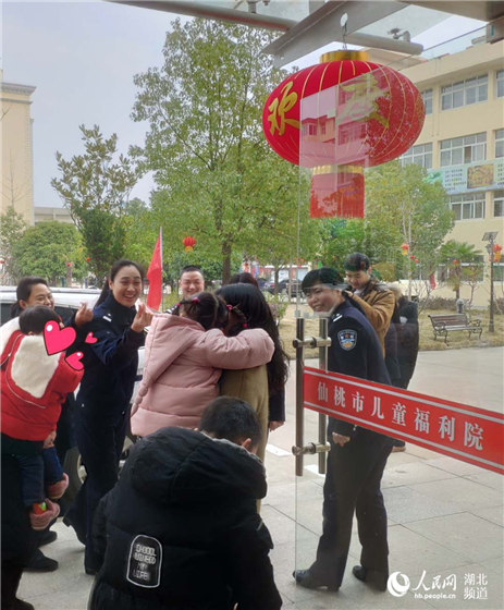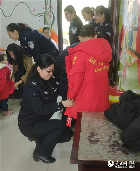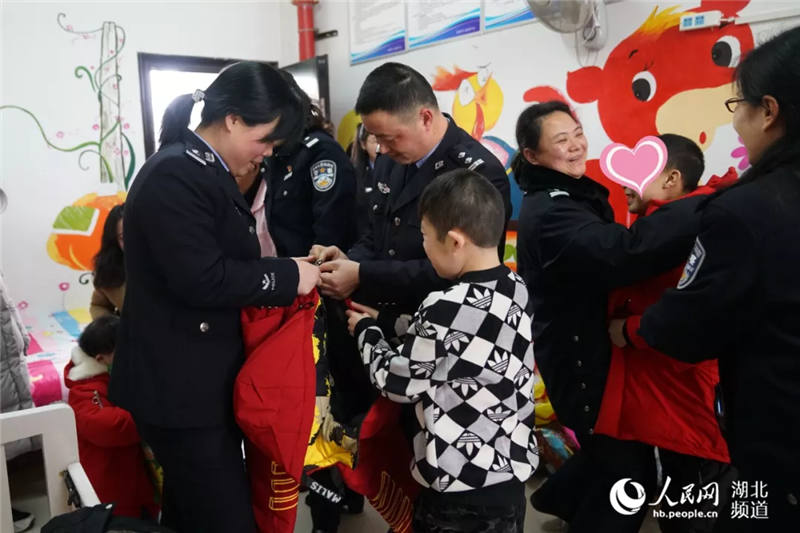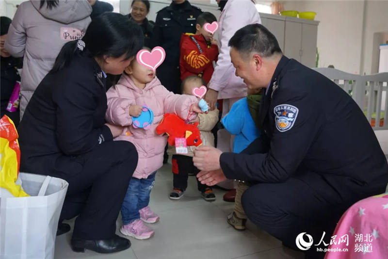 2月1日,在湖北省仙桃市儿童福利院欢声笑语,暖暖的年味扑面而来。仙桃市公安局青年志愿者服务队民警带着新年礼物看望孩子们。