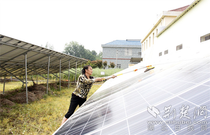 4月17日,仙桃剅河镇汪场村村部光伏发电中心,许友珍拿着拖把熟练地打扫着发电板上的灰尘,虽然汗如雨下,却挡不住脸上幸福的笑容。