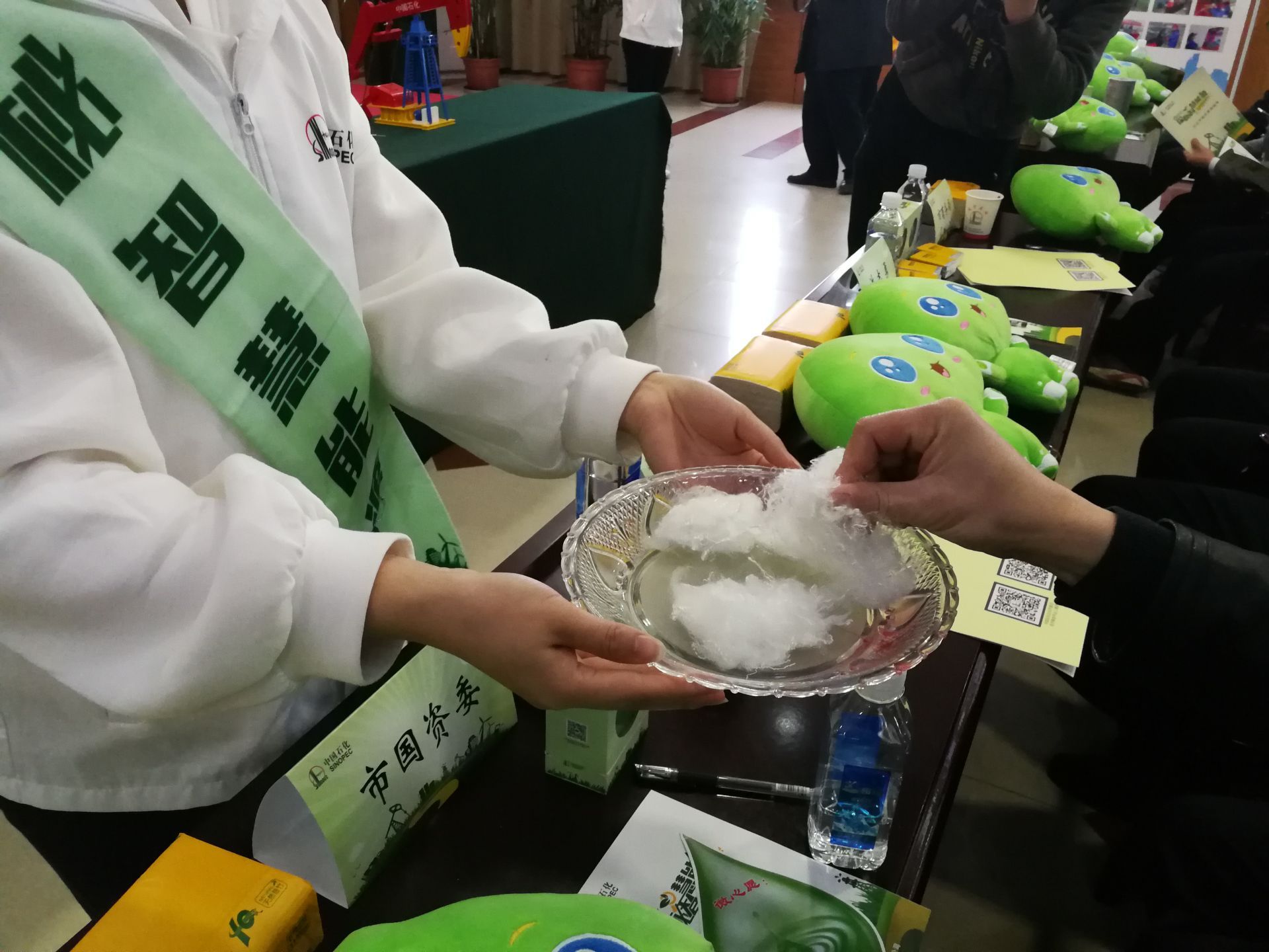 图:咸宁社会公众代表用手触摸一种由石油制成可溶于水的新纤维。