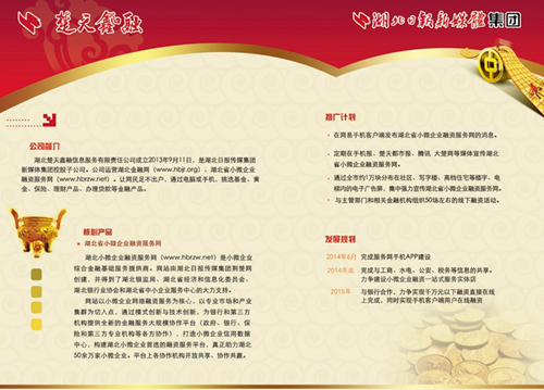 负责运营由湖北省金融办主办、荆楚网协办的湖北金融网。作为湖北重要金融服务平台、最权威的财经网站、世界了解湖北金融的重要窗口,湖北金融网致力于为广大网友传递权威、及时的金融行业资讯,并提供专业、可行的投资理财指导,让市民理财变得简单、轻松。