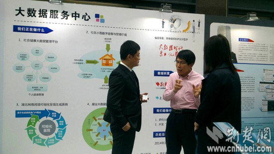 图为:湖北日报新媒体推介会上,参观者在了解大数据服务中心相关情况