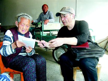图为:本报记者在通城采访胡梦生遗孀尚凤英老人。(通讯员胡志全摄)