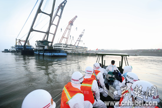 第一天湖北消防就实现了五个第一:第一批成建制到场救援的部队、第一时间排除路障的专业队伍、第一时间提供陆上照明的战斗团队、第一批参与水下救援的力量、第一个建立沉船点与陆上指挥部前后方通信联络的团队。