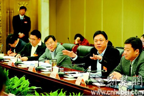 图为:湖北团代表畅谈加强法制建设,推进生态文明等。(记者彭小萍 摄)