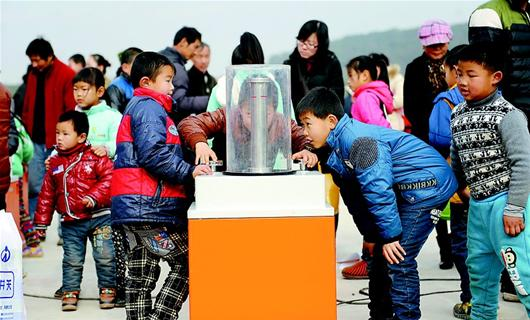 图为:2015年1月20日,鄂州市华容区红莲湖第一小学,孩子们被“三下乡”活动展示的科学仪器吸引。(记者 孙文 摄)