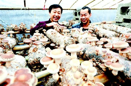 图为:科技扶持,让食用菌成为保康县农民增收的特色产业。图为2015年11月20日,城关镇三溪沟村村民喜看香菇长势。(视界网 陈泉霖 摄)