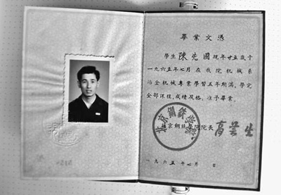 二田口国博1965年毕业于北京钢铁学院时的毕业文凭。本报记者 刘军国摄