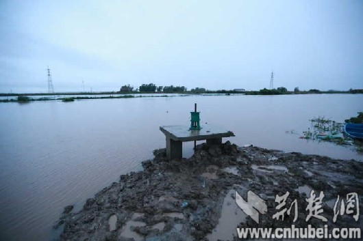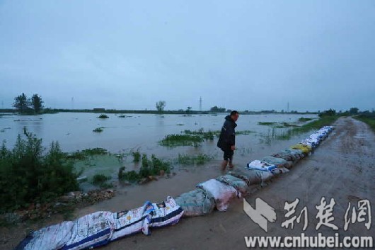 下午4时许,西喇叭湖子堤又出现漫堤险情,抢险队实施紧急施工作业,与漫过堤坝的洪水赛跑。荆楚网记者傍晚赶到现场时看到,漫堤处已填高了1米,险情暂时排除。