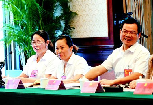 图为:26日,咸宁代表团邱武代表(中)就创新驱动有关内容发言。