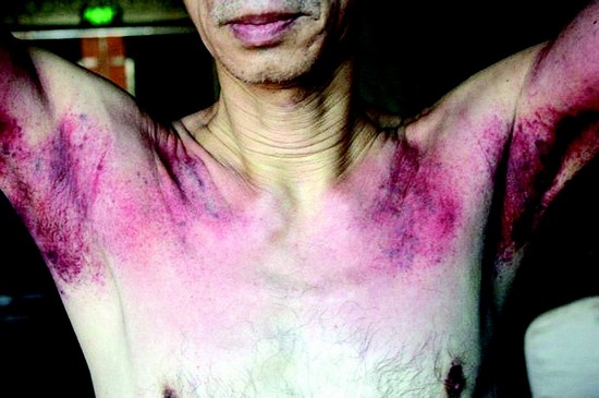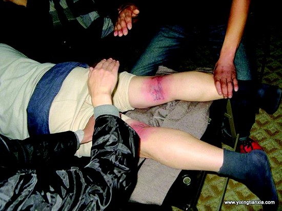 “用力!用力!”一名女子给记者做示范,拍打另一名女子的肩膀。被拍打女子闭着眼睛,紧咬牙关,肩膀几分钟内就被拍成紫红色。不远处一名趴在按摩床上的女子,被另外两名女子拍打出哭声,仍在咬牙坚持。