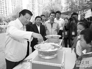 2011年9月18日,时任中宣部部长的刘云山在北京与小学生们一起做节水小实验