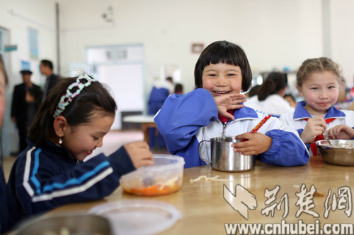 荆楚网消息(通讯员 熊鹰)9月17日,伴随着清脆的下课铃声,新疆维吾尔自治区乌鲁木齐县灯草沟中学的学生们在食堂门前排起了长队——今天与以往不同,新疆第一所也是全国第3000所春苗营养厨房在该校落成,200多名学生从此可以每天吃上可口的营养餐。