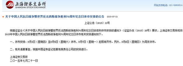 根据证监会《关于中国人民抗日战争暨世界反法西斯战争胜利70周年纪念日放假和休市安排的通知》(证监办发〔2015〕26号)要求,上海证券交易所现将2015年中国人民抗日战争暨世界反法西斯战争胜利70周年纪念日休市有关安排通知如下。