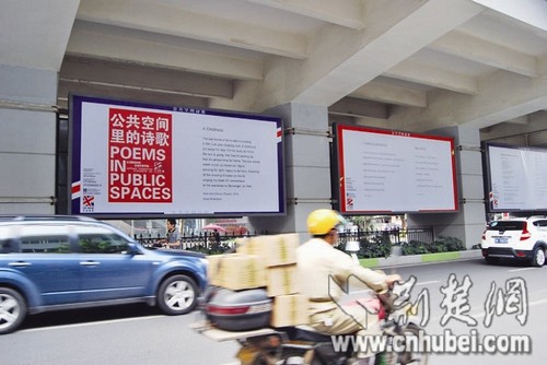 在京汉大道大智路口等多个繁华地段轻轨站下,桥墩上挂起多幅长达五六米的诗歌广告牌,在街头众多的商业广告中显得格外抢眼,成为街头一道亮丽风景。
