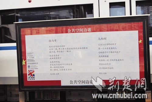 省作协秘书长高晓晖说,此次展示活动的作品,116首出自45位湖北诗人之手。17首出自英国诗人之手。“艺术中国·公共空间的诗歌”展示活动,把湖北和英国当代知名诗人的作品,贴在轻轨车厢、车站和桥柱等处,将推进武汉与英国之间的文化交流,也让市民感受诗人、诗歌的魅力。