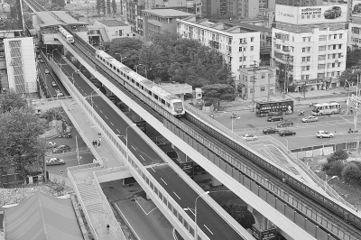 昨天,记者在现场看到,全长680米的跨武胜路高架建在轻轨1号线下面,桥墩两侧各有两股车道,如同两根扁担夹住桥墩。两根“扁担”中间的绿化带种有翠竹、冬青等花木。因邻近民房,车道外侧均安装了隔音屏。