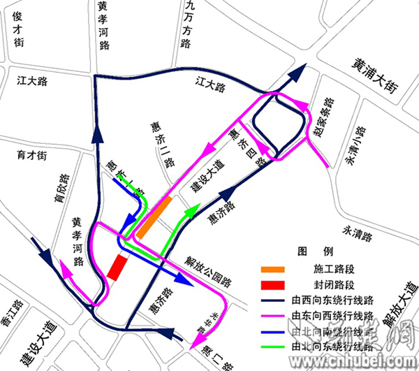 由西向东方向,原经由建设大道施工路段前往黄浦大街方向的车辆,可通过惠济路、惠济四路、黄孝河路、江大路绕行;过境车辆请绕行解放大道、发展大道。
