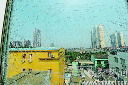 昨日上午9时许,楚天都市报记者驱车从武昌火车站上白沙洲高架桥,看到数公里长的高架桥两边,都是长宽约2米的隔音屏。记者细数发现,共有92块隔音屏出现了不同程度的破裂,在阳光的映照下十分显眼,有块隔音屏上还留有直径二三厘米的洞孔。