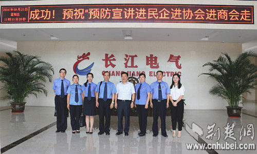 武汉市检察院反贪局预防处处长陈正军(左四)、宣讲团领导与长江电气董事长王新成(右四)合影。通讯员叶书兰 摄
