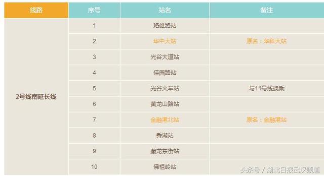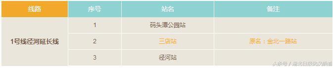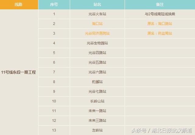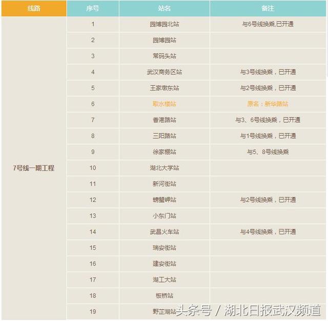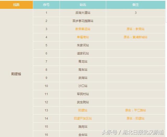 经过比对原工程名,共有14座车站更名:分别是7号线原新华路站更名为取水楼站,8号线原幸福大道站更名为中一路站、原三金潭车辆段站更名为金潭路站,1号线径河延长线原金北一路站更名为三店站、原马投潭站更名为码头潭站,阳逻线原新荣站更名为新荣客运站、原黄浦新城站更名为幸福湾站、原武湖大道站更名为青龙站、原平江路站更名为阳逻站、原阳逻站更名为阳逻开发区站,11号线原湖口路站更名为湖口站、原药监局站更名为光谷同济医院站,2号线南延线原华科大站更名为华中大站、原金融港站更名为金融港北站。
