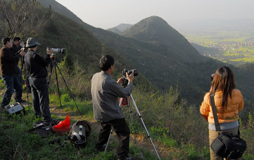 新华网湖北频道3月25日电(冯怡红摄影报道)3月24日,一群旅游摄影爱好者登上海拔200余米的湖北省武穴市田镇办事处笠儿脑山,拍摄邻近的大法寺镇桂家畈万亩盛花期油菜子油菜。2009年1月,湖北省人民政府命名武穴市为全省油菜大市。为进一步推进该市油菜产业发展,展示武穴市油菜产业辉煌成就,继续做大做强做好武穴油菜产业,湖北省武穴市农业局联合武穴市文联及有关单位举办“武穴市首届油菜产业摄影大赛”,此次活动吸引了该市的摄影爱好者,市内外、甚至省内外的旅游观光、摄影爱好者,使油菜产业成为旅游新产品。