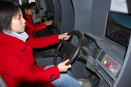 新华网湖北频道3月9日电 罗田县一些返乡农民工放弃外出盲目寻找工作的想法,纷纷来到县工业学校学习汽车驾驶技术,自春节前后至今有300余农民工学成后走上了就业岗位。图为农民工女青年在罗田工校汽车模拟驾驶室练习时的情景。王志高 张朝珍 摄
