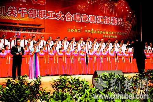 由省直机关工委主办的“歌唱祖国——省直机关干部职工大合唱”竞赛活动,是省委、省政府庆祝新中国成立60周年系列庆典的重要内容。自今年6月启动以来,省领导高度重视,各部门大力支持,广大干部职工积极响应,共组织100支队伍、8000余人参赛,1万多名干部职工到现场观摩,省委书记罗清泉、省长李鸿忠等省领导和省直各部门主要负责同志带头参加演唱。参加汇报演出的22支队伍,代表省直各条战线,用精彩的演出,唱响共产党好、社会主义好、改革开放好、伟大祖国好、各族人民大团结好的主旋律,展示了省直机关干部职工良好的精神风貌。