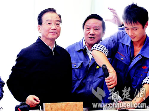图为:温家宝总理在武重大件加工车间与工人交谈。(记者王威 摄)