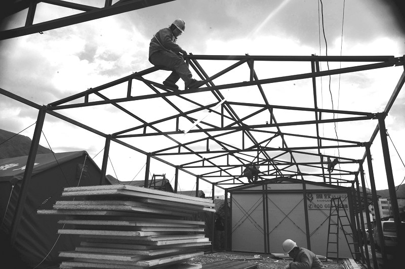 体育场安置点内,正快马加鞭建设板房。施工的师傅介绍:“板房是前天才开始建的,今天的任务是建成三排60间,先满足医疗需求,接下来两天内将加快建设速度,安置灾民的‘帐篷城’将很快变成‘板房城’。”