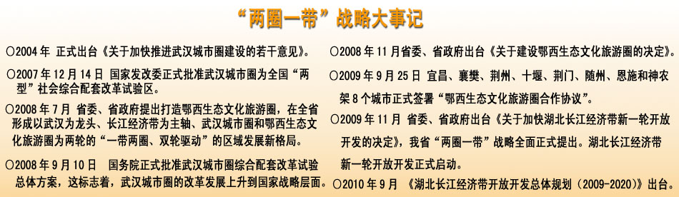 ●2005年8月21日至23日,胡锦涛总书记在鄂考察,要求湖北以科学发展观统领发展全局,把湖北建成促进中部崛起的重要战略支点。 ●2005年8月29日,省委召开领导干部大会,传达学习胡锦涛同志在湖北考察时的重要讲话精神。 ●2005年9月6日,国家开发银行与湖北省人民政府在汉签订《促进中部崛起开发性金融合作协议》,国家开发银行向我省“十五”、“十一五”规划建设的项目提供500亿元政策性贷款。 ●2005年底,“努力成为促进中部地区崛起的重要战略支点”写入湖北省“十二五”规划。 ●2007年6月,湖北省第九次党代会突出强调,要努力把湖北建成促进中部崛起的重要战略支点。 ●2007年12月14日,国家发展改革委正式批准武汉城市圈为全国“两型”社会综合配套改革试验区;2008年9月10日,国务院正式批准武汉城市圈综合配套改革试验总体方案。 ●2008年4月26日至28日,第三届中博会在武汉举行,万商西进,汇聚江城,与中部六省共商发展大计。 ●2008年7月,省委、省政府提出打造鄂西生态文化旅游圈,在全省形成以武汉为龙头、长江经济带为主轴、武汉城市圈和鄂西生态文化旅游圈为两轮的“一带两圈、双轮驱动”的区域发展新格局。 ●2009年9月,国务院通过《促进中部地区崛起规划》,湖北构建促进中部地区崛起重要战略支点进入国家战略层面。 ●2009年12月,继北京中关村之后,武汉东湖开发区被国务院批准为全国第二个国家自主创新示范区。