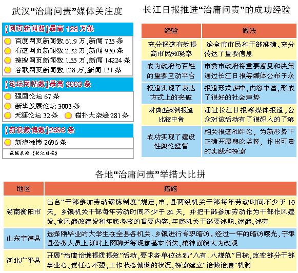 截止7月上旬,武汉市各类媒体发表治庸问责新闻稿件达400多篇,网络相关信息400多万条。在武汉“治庸问责”的推进中,新闻媒体尤其是市委机关报《长江日报》起到非常重要的作用。从4月7日起,《长江日报》推出“治庸问责武汉风暴”系列报道。截至7月18日,开辟5个专栏,发表27篇系列评论和一批新闻报道。