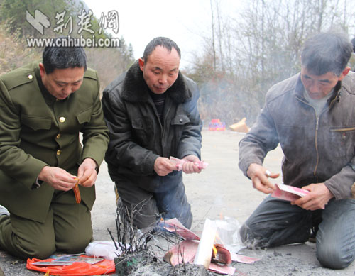 离开前,谭永甲、陈祥楚等三位村民,在操福善遇难前斜倚的排水沟附近,按当地送别亲人的风俗,恭恭敬敬地烧纸、燃鞭,噙泪念道:“操局长,您一路走好,记得常回村里面看看。”