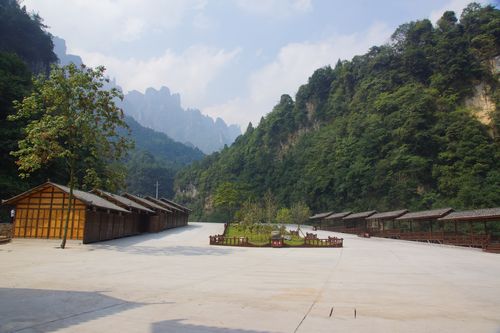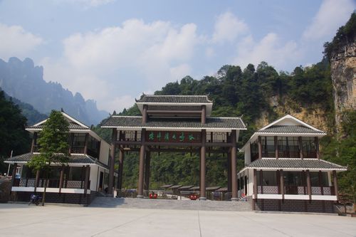 谷底区域环境优良,通过旅游配套设施和增加人工景观,可以充分利用现有自然环境和地势,打造了富有古色韵味的的景区大门。景区大门别出心裁,采用牌坊模式,造型以土家风情为主,石木结构建造。富有古色韵味,雕栏刻木,体现土家人文气息。