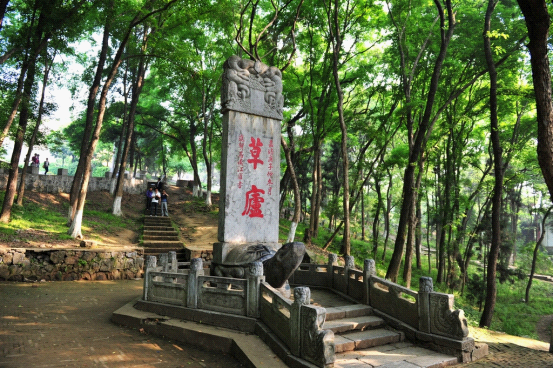 抱膝亭后有明朝嘉靖庚子年(公元1540年)雕塑的大型龟座“草庐碑”。碑高大雄伟,既古朴又富有生趣,无疑是一件大型艺术品。碑的正面有石南江汇题“草庐”二字,碑阴有“龙卧处”三个大字,当年诸葛亮在出山前,他的老师庞德公赐予他的雅号是“卧龙”,说他是“蛟龙误入浅水湾,一遇祥云便化龙”所以他的寓居地也被后人称作“龙卧处”。据说,碑座的龟是龙的大儿子,叫赑屃,善于负重。