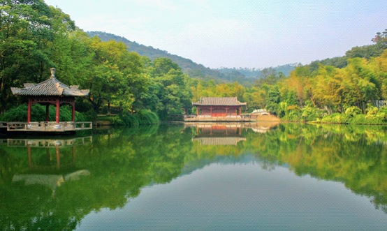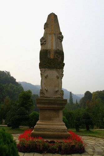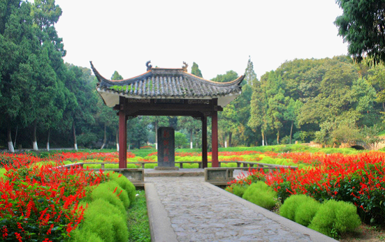 顺着老龙洞,沿着美丽的水榭池塘下行,就可以看到一块由须弥座、铜鼓、羽扇组合而成,巍峨耸立的纪念碑刻“江泽民题字碑”,简称“江碑”。江泽民题字碑,上书“古隆中诸葛亮故居”八个大字,是江泽民总书记1999年前往隆中视察时亲笔题写于草庐之中。题字碑下部的须弥座常用于神座的装饰,是一种传统的彰显地位的装饰手法;中间的铜鼓,原为诸葛亮发明的行军战鼓,代表着诸葛亮为蜀汉征战一生的历史功绩;上方的羽毛扇,是诸葛亮智慧的独有标志。
