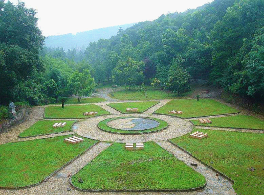 江碑下方的八卦园,建于1998年,园内正中有一个八卦形的图案装饰。八卦图形内有黑白两色的阴阳鱼,白鱼为阳,黑鱼为阴,阴阳相生乃万物发展之源,阴阳两仪生四象,四象生八卦,代表万物相辅相成,相斥相克的天地大道。