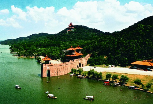 陆水湖 位于赤壁市境内,距市区2公里。因三国东吴大将陆逊在此驻兵屯田而得名。陆水湖景区总面积260平方公里,其中水域面积57平方公里,蓄水量7.2亿立方米。陆水湖主坝是三峡的试验坝,8号副坝全长1548米,高28米,号称亚洲第一粘土坝。陆水湖岸线曲折,水质清澈碧绿,水中岛丛出没,400多个翡翠岛屿星罗棋布,形态各异。陆水湖风景区中陆水营寨位于黄龙古镇虎山林区,由虎山、画山的50多个大小山头、冲垅及岗地构成。其主要景点有:吴城、寨门、陆逊雕像、拜将台、观军亭、烽火台、夷陵长廊、护寨水寨、陆逊行辕等,特别是花园坡遗存着孙郎州、吴王殿、丁奉寨、抛金石等24处三国遗址。如今陆水湖中三国城景区主要景观有三国城楼、桃园三结义、三顾茅庐、三英战吕布、三国鼎立、草船借箭等,引人入胜。陆水湖风景名胜区的"中华水浒城",占地4200平方米,是中央电视台《水浒》拍摄三个基地之一,由仿宋民俗的郊野一条街、雄伟壮观的聚义厅、古朴粗犷的梁山后寨等三大景区组成,乃天然"水泊梁山"。引人入胜的仿古街,坐落在雪峰山北麓陆水湖南岸,是仿古建筑"江州城"的一部分,由大小不同,造型别致的25栋房屋组成。它以有限的空间浓缩和再现了北宋时期的街屋店铺风貌。王婆茶馆、狮子楼、潘金莲宅、武大郎炊饼店、西门庆生药铺、镇关西肉铺等景观生动逼真。