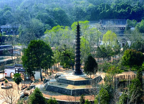 玉泉寺及铁塔 明、清时期建筑群。位于当阳市玉泉山东麓。因其佳境独擅而享有"三楚名山"之誉。占地面积约5.3万平方米。是湖北省最大的佛寺,被誉为"荆楚丛林之冠"。玉泉寺为中国佛教天台宗的四大祖庭之一,初名普净庵,东汉年间,高僧普净禅师云游到此,结茅为庵。夷陵之战时,刘备亲临当阳为关羽设祭,并扩建原庙,兴建"显圣祠"。隋开皇十三年(593年),高僧智凯奉诏建寺,改名玉泉寺,为智者道场。晋王杨广赐额"玉泉寺",与南京栖霞寺、山东灵岩寺、浙江国清寺并称天下丛林"四绝"。唐仪凤三年(678年)神秀在此弘扬禅法,玉泉寺成为海内外佛教徒景仰的圣地。宋真宗天禧五年(1021年),明肃皇后又下懿旨扩建,其规模达"为楼者九,为殿者十八,僧舍三千七百","占地左五里、右五里,前后十里",并改额"景德禅寺"。元、明、清均有所修葺。玉泉寺坐西朝东,中轴对称布局,有铁塔、山门、天王殿、大雄宝殿、毗卢殿、东堂、西堂、东禅堂、般舟堂、藏经楼等。大雄宝殿为寺内主体建筑,始建于明代,面阔七间41米,进深五间24米,高23米。重檐歇山顶,抬梁式构架,立柱72根,天花、藻井均施彩画,1982年落架大修。殿前有隋代铁镬、元代铁釜和铁钟。殿侧有相传为唐代吴道子所作观音画像石刻。玉泉铁塔铸于北宋嘉六年(1061年)。位于玉泉寺前方。原名"佛牙舍利宝塔"。通高17.9米。八角十三层仿木构楼阁式铸铁建筑,重达3.83吨。双层须弥座,铁铸塔座、塔身,铜制塔刹。塔身每层出平座,置斗拱出檐,底层柱角铸八个力士,走马板上铸有二龙戏珠、八仙过海、海山、水波、海藻等浮雕图案。相间诸面各设壸门龛和佛像。角梁飞檐的前端铸有凌空的龙头,悬挂风铎。第二层东、南、西、北四面分别铸有塔名、高度、重量、建造年月及工匠姓名。1992年落架大修时对地宫进行了清理,地宫距地表0.5米~2.34米,六角形立柱砖石结构,竖井式,柱间嵌石板。壁外侧以绳纹砖围砌护墙。内置大石函,通高0.8米,由上下函合扣,函顶楷书铭文,四壁雕花纹。1982年被国务院公布为第二批全国重点文物保护单位。
