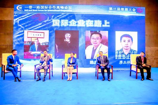 图为:“一带一路”国际合作高峰论坛上,嘉宾们围绕“国际企业在路上”话题展开讨论。