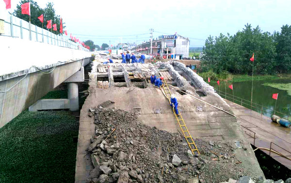 红三大桥(老桥)始建于1974年,全长124米,桥宽10米,为3跨钢筋混凝土双曲拱桥,2016年初发现安全隐患后,经湖北省公路工程咨询监理中心鉴定为4类危桥,洪湖市公路管理局立即着手大桥重建工作。重建方案为首先新建红三大桥的右幅,再在拆除老桥的基础上,新建红三大桥的左幅。重建后的红三大桥,长251米、宽22米,为双向4车道箱式梁桥,设计时速60 公里,汽车荷载等级为公路—I级。