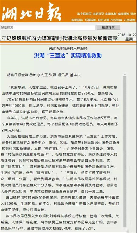 楚网讯(通讯员 潘丰庆)10月29日,《湖北日报》当天报纸第三版以题为《民政协理员进村入户服务 洪湖“三直达”实现精准救助》,介绍洪湖民政“三直达”工作法。