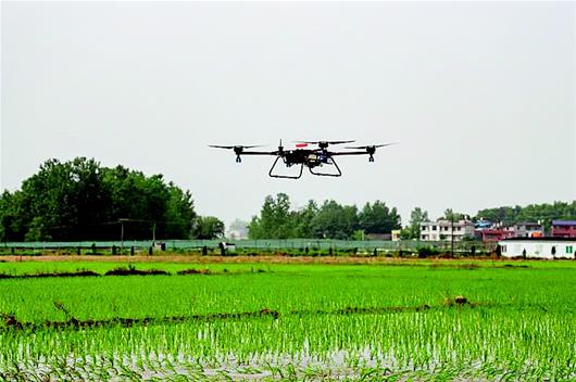 图为:二〇一八年五月,阳新县浮屠镇,水稻机进行插育秧作业﹙上图﹚,无人机实施病虫害防治﹙下图﹚。﹙湖北日报全媒记者田悦通讯员王彦飞柯赟摄﹚